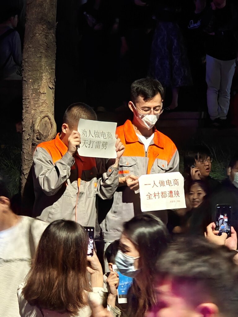 两名身穿电商从业者制服的男子举着标语,建议其他人不要进入该行业。它曾是中国增长最快的行业之一,但近几个月来经历了销售额暴跌和许多企业倒闭。