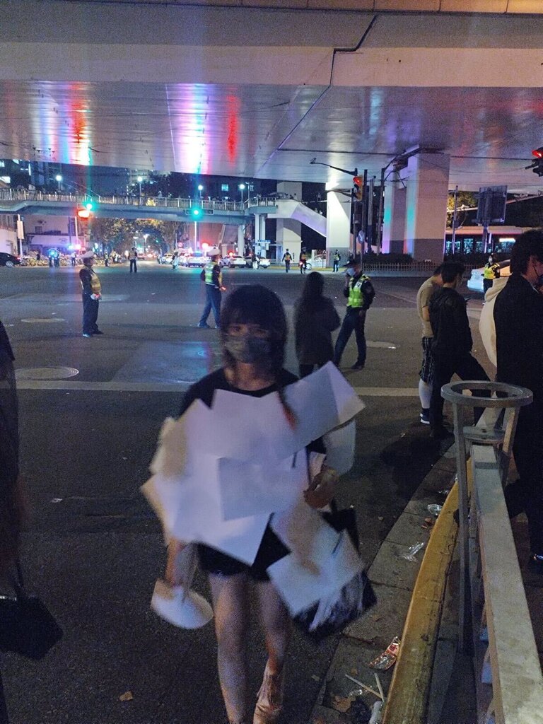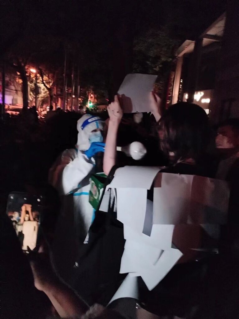 一个女人在她的衬衫上贴满了白纸——这是指去年爆发的反对中国流行病限制的抗议活动。在中国,白色是葬礼的颜色,而许多抗议者将白纸挡住头或脸。