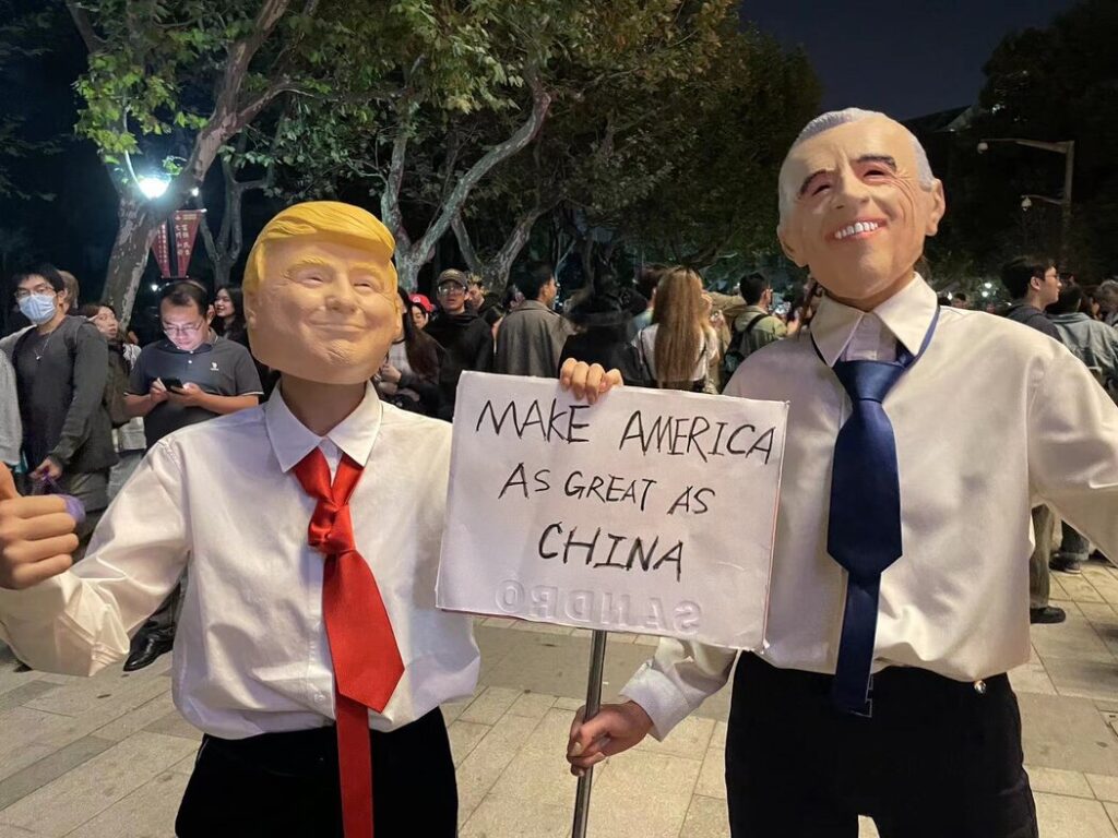 上海的两位艺术家奥利维亚·周(音)和莉莉·李(音)打扮成特朗普和拜登总统的样子,举着一个对特朗普2016年竞选口号做了改动的标语。周女士说,她们选择这条信息,是因为它既有讽刺意味,又有开放的解释空间——一名安保人员让她们把它拿掉。在她们拒绝后,他拿起牌子,把它撕了。