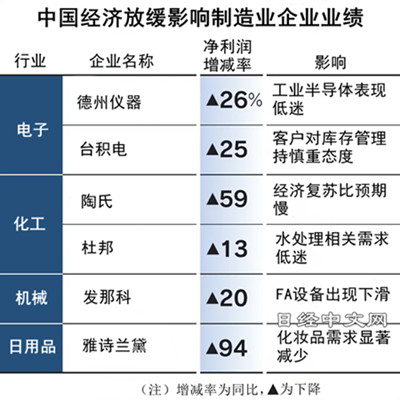 美国化工大型企业陶氏化学的利润下降59%,杜邦利润下降13%。随着中国的设备投资放缓,成为机床大脑的数控(NC)装置等工厂自动化(FA)设备也出现下滑。日本发那科的利润减少20%。作为业绩先行指标的订单量在中国下降了35%。