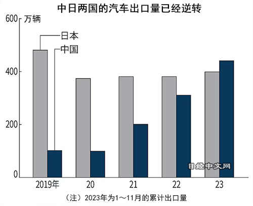中国汽车工业协会的数据显示,1~11月中国出口量(速报值)同比增长58%,达到441.2万辆。而日本的出口1~11月增长15%,增至399万辆,预计2023年全年也仅为430万辆左右。