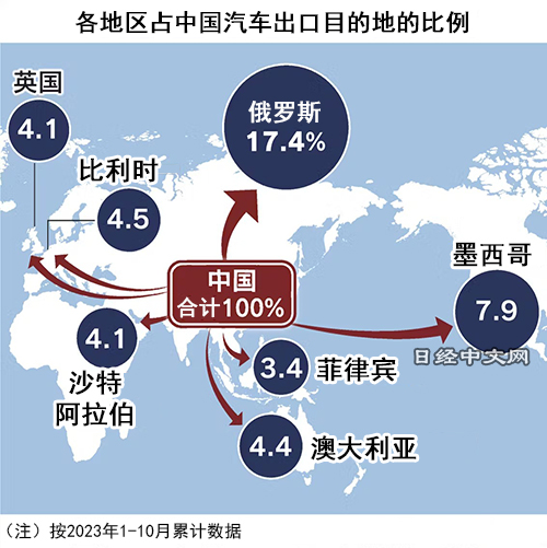 中国2023年汽车出口量将超过日本,首次跃居世界首位。中国车企将销售地区扩大至欧美撤离后的俄罗斯、作为进驻北美跳板的墨西哥、不断转向纯电动汽车(EV)的欧洲和东南亚等全球范围,有观点认为中国2030年的出口量将比2023年翻一番,超过1000万辆。