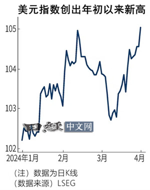 美元不仅兑日元升值,兑其他主要货币也呈现升值态势。美国洲际交易所(ICE)计算的美元指数4月1日超过105,刷新年初以来的最高点。美元指数由兑欧元、日元、英镑、加元、瑞典克朗和瑞士法郎这6种货币的汇率构成,数字越高越表示美元相对于这些货币被买入。