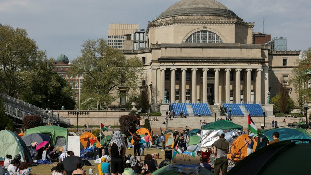 今年春天爆發大規模挺巴示威的哥倫比亞大學(Columbia University),部分學生和教職員中午於校園內廣場拉起布條與標語聲援巴勒斯坦,哀悼在戰爭中死去的數萬平民。