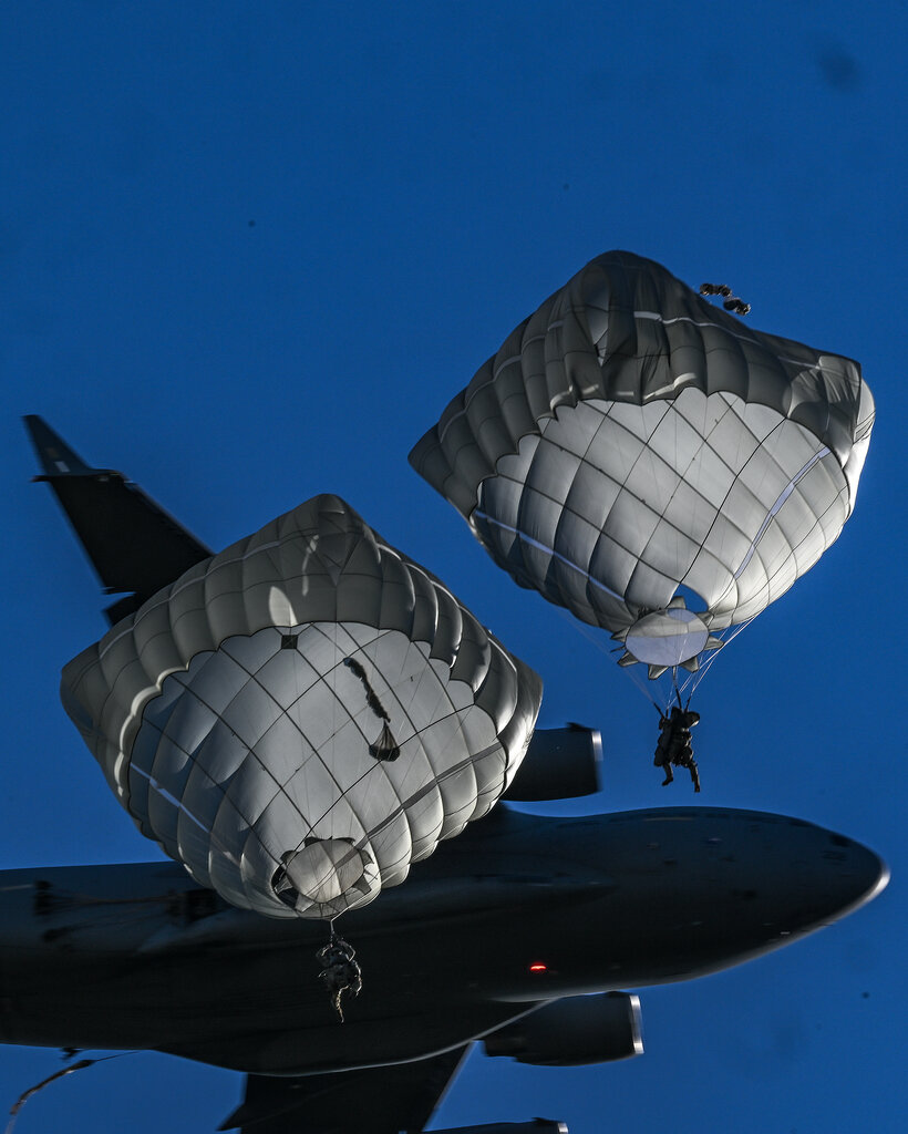从地面上看,这一幕很容易让人联想到陆军空降兵广告,一波波伞兵从C-17飞机的一侧跳出,飘向地面,伞在空中张开。所有士兵都应该配备了两个降落伞,包括一个备用降落伞,以防跳伞后主伞在四秒内没有展开。
