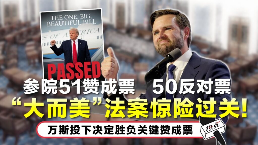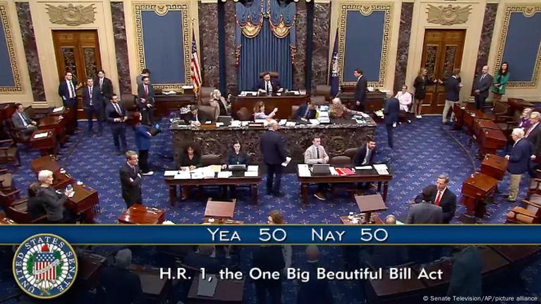 (德国之声中文网)美国参议院週二(7月1日)表决被称为“大而美”法案的预算案,因3名共和党人倒戈,与民主党人一同投下反对票,使得投票陷入50-50的僵持,最终由副总统万斯(JD Vance)投下了决定性的一票,让法案过关。