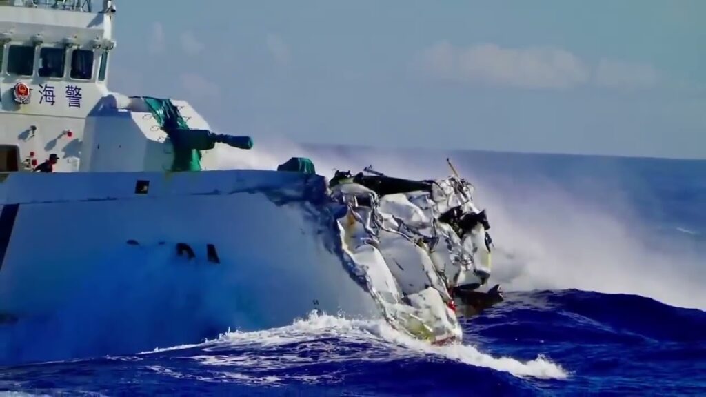 〔即時新聞/綜合報導〕中國海軍與海警船日前在黃岩島海域夾擊菲律賓海岸防衛隊船隻,結果自家艦船不慎相撞,成為國際糗聞。從菲律賓公布的影片發現,兩船相撞時,船首疑似噴濺血霧,外界懷疑中國海警船上有人員傷亡。而根據《環球時報》昨日獨家公布的中方視角影片,可見中國海警船在與自家海軍相撞前,船頭共有6名人員正在作業。