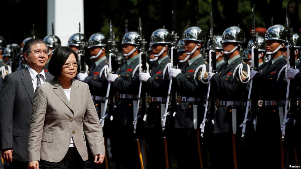 台湾总统蔡英文在台湾南部高雄市检查仪仗队仪式。