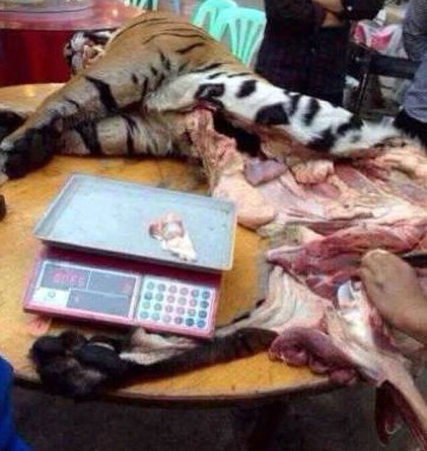 2014年3月,广东湛江市公安局在雷州破获一宗非法猎捕、宰杀珍贵、濒危野生动物案件,缴获刚被宰杀的老虎1只、虎制品若干。当地杀虎已是半公开,消费者多为干部老板。虎肉500元/斤,虎骨7000元/斤。 (网络图片)