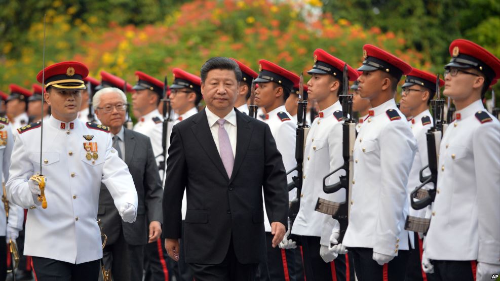 2015年11月6日,中国主席习近平和新加坡总统陈庆炎在新加坡的欢迎仪式上检阅仪仗队