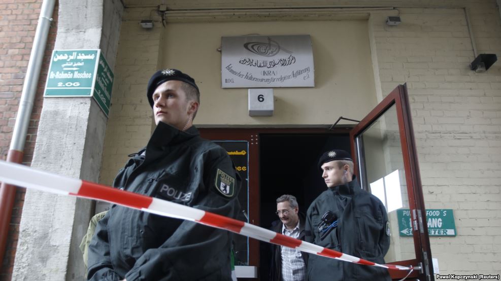 德国警察在一座清真寺和伊斯兰文化中心外面站岗。警方拘留了两个中东人,怀疑他们购买材料,准备发动炸弹攻击(2016年9月8日))