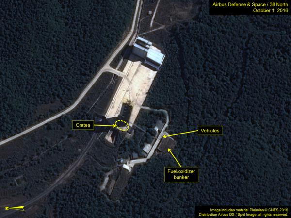 另一方面,朝鲜此前进行过新一代火箭发动机试验的实验台也出现了新的变化,《38度北》网站判读照片称,火箭测试台的排焰场区面积扩大了一倍以上,同时有列车出现在了实验台旁边带有顶棚的装卸区。这表明朝鲜可能将进行新的火箭试验,或者正在进行上次试验的后续工作。