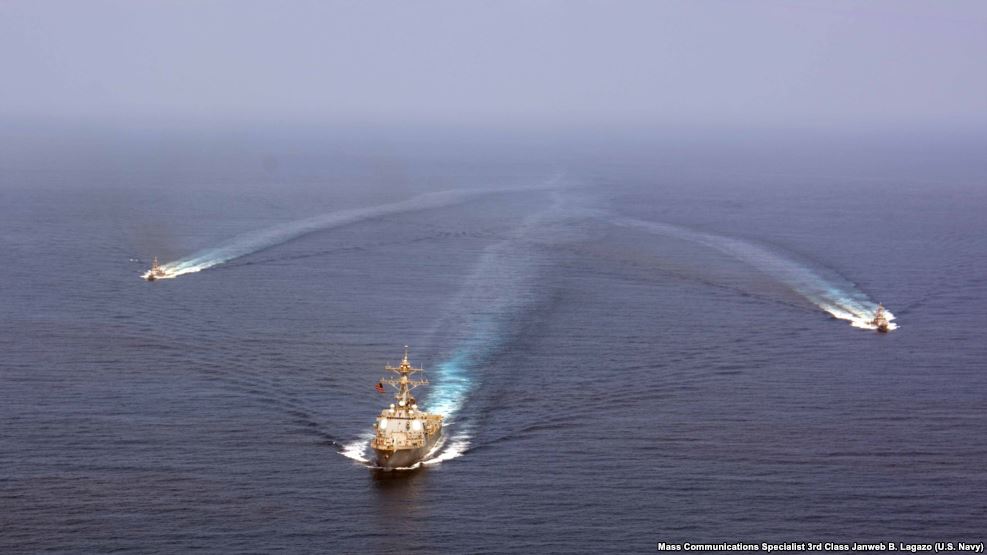 美军导弹驱逐舰梅森号与飓风级近海巡逻艇暴风雨号和美军巡逻艇暴风号在阿拉伯海进行军演。(2016年9月10日)