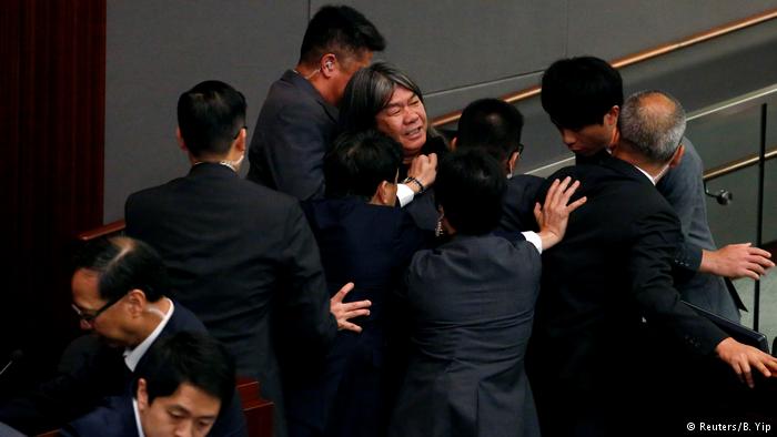 “立场新闻”还介绍,换房后,“大批保安筑人链包围主席台,民主党许智峯成功闯入保安包围圈内,拒绝离开,大喊:‘抗议主席滥权’,被三名保安拉住。”