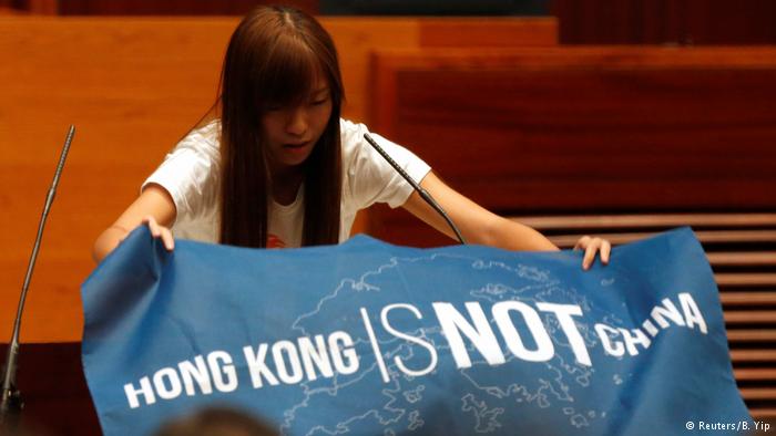 (德国之声中文网)非建制派议员在就职宣誓仪式上打出了"香港不是中国的一部分"的蓝色旗帜,呼吁在这座半自治的中国城市实行"民主自决"。