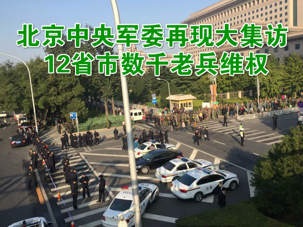 记者:这些来自中国多省的退伍志愿兵昨天早上就陆续赶到北京西长安街上的中央军委大楼外面。目击者说,先到的在军委门外静坐,后到的排队进入现场,唱着军歌和鼓劲的歌曲,团结就是力量,打靶归来等等。他们拉起横幅,表达对生活现状的不满和对习主席、党中央的拥护,以及对军内贪官大老虎出卖他们的利益表示痛恨。