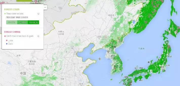 这真是一幅令中国人悲伤的地图,现在我们来看看它是怎样的悲伤法。最深的绿色表示覆盖率在75%-100%,次深的绿色是50-75%,浅绿是25-50%(如下图示)。灰色的表示覆盖率低于25%。粉色的部分,表示树木正在减少。