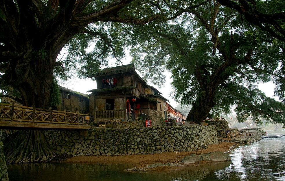 在云水谣古镇,最吸引人的莫过于“云水谣古栈道”。古栈道沿溪而建,全长达10余公里,全部由鹅卵石铺成。古栈道的中段有一大片古榕树群,盘根错节,枝繁叶茂,蔚为壮观。这13棵老榕树组成了福建省内最高最大最为集中的千年古榕树群。其中被誉为“八闽第一榕”的那一棵,树冠覆盖面积1933平方米,树丫长达30多米,树干底端要10多个大人才能合抱,令人叹为观止。同行的村里老人说,当地人仍然习惯了叫这条路“古幽道”,“这路是开基祖简德润于元至正十八年修建的,是南靖境内通往府地乃至进京的必经之路。因为幽静,所以就叫古幽道。”云水谣古栈道自然是好的,然而那是后来叫给外人听的,“长教古幽道”才是属于历史的记忆。我们听着老人的喃喃自语,只能报以局促的微笑,想到随着时间的逝去,长教古幽道的记忆终将被湮没,便不由也跟着多了几分唏嘘。