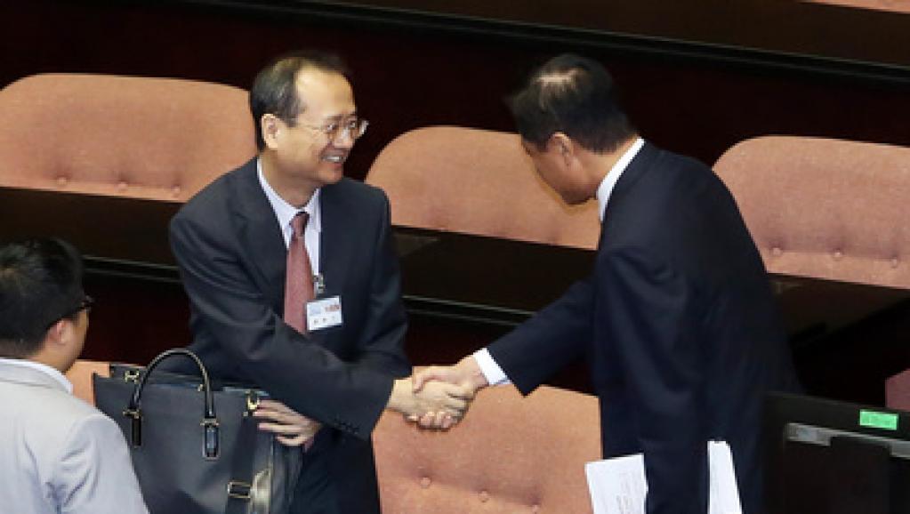 立法院全院委员会2016年10月13日上午进行司法院大法官并為院长被提名人许宗力行使同意权询答,在询答结束后许宗力(左)与立法院长苏嘉全(右)握手致意。