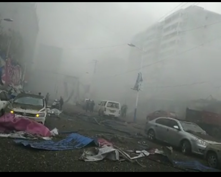 从当地群众提供的视频看到,爆炸发生后,扬起的灰尘、浓烟布满了该镇整条街道。从视频上看,这栋建筑物完全坍塌,附近还有多名头部受伤流血的群众经过。据这名群众介绍,爆炸系由该建筑物私藏的炸药爆炸引发。