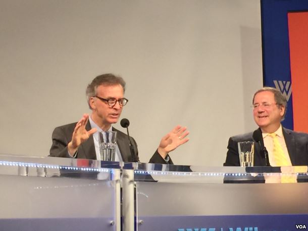 朝鲜核问题专家利特沃克(左)与纽约时报记者桑格 (美国之音莉雅拍摄)