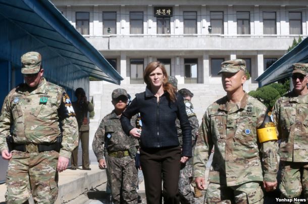 美国驻联合国大使萨曼莎·鲍尔和美国军人在韩国和朝鲜之间的板门店停战村南侧(2016年10月9日)