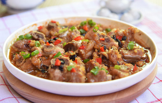 4、将白椒剪碎,和豆豉,姜末一起盖到排骨上;