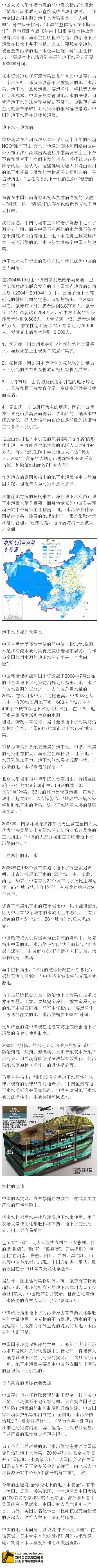 中国大陆的地下水污染极其严重,90%的城市地下水受到不同程度的污染,普遍污染物为「三氮」。农村地区地下水受重金属污染严重,并且亚硝酸盐、硝酸盐和氨氮普遍超高。大陆环保官员表示,中国的地下水污染已经到了不得不治理的地步,再不治理,农村地区和城市都将面临没有水喝的困境。