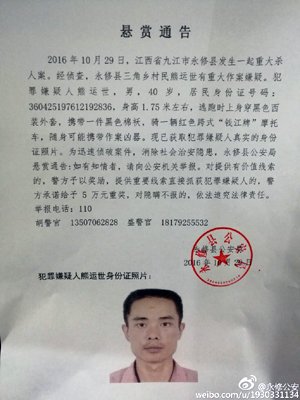 九江警方通报称,犯罪嫌疑人熊运世身高1.75米左右,逃跑时上身穿黑色西装外套,携带一件黑色棉袄,骑一辆红色摩托车,随身可能携带作案凶器。警方悬赏奖金20万缉凶。警方称,被砍死的看守所民警黄桂富,在熊运世被关在看守所时并未任职。