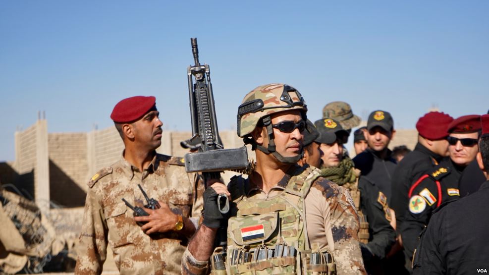 2016年11月3日,伊拉克政府军将领在警卫守护下聚集在摩苏尔城边的戈亚里,举行宣布胜利的记者会。(美国之音德特默拍摄)