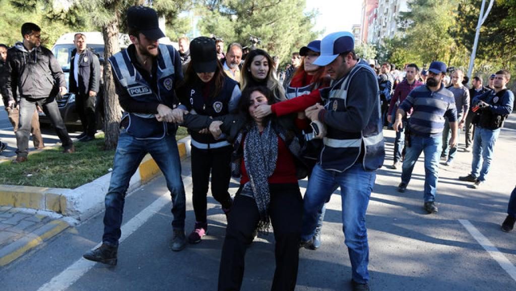 2016年11月4日在土耳其东南部城市迪亚巴克尔发生炸弹爆炸之后,警方逮捕一名抗议者。