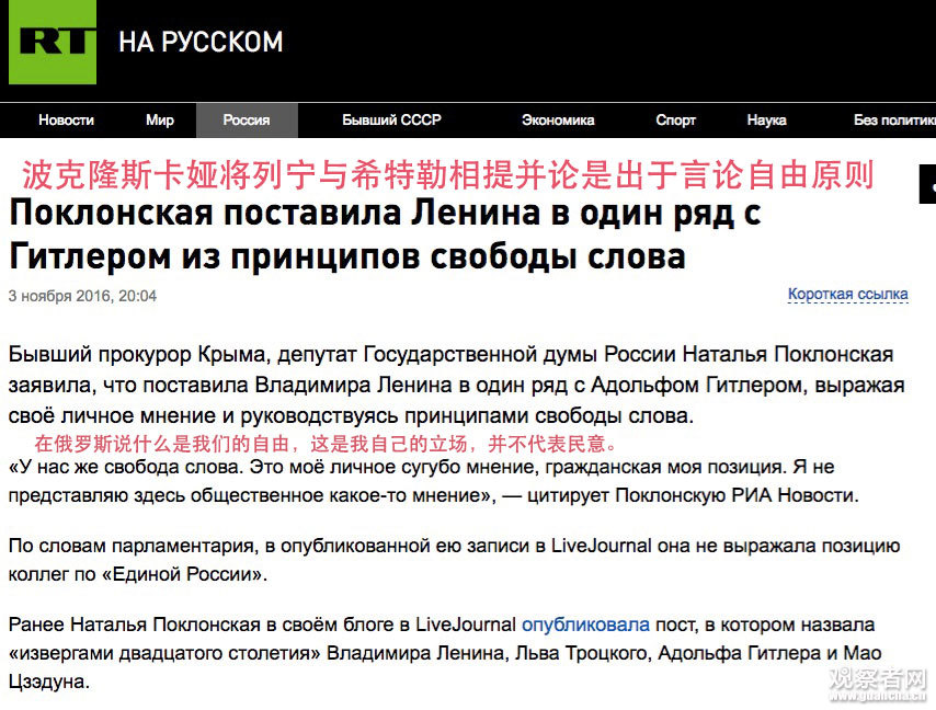 11月4日是俄罗斯的民族统一日。但是,克里米亚前检察长、俄罗斯现任国家杜马议员纳塔莉亚·波克隆斯卡娅出席节目的一段录音流出,引发舆论一片哗然。她盛赞俄罗斯末代沙皇尼古拉二世,侮辱列宁、毛泽东,并将他们与希特勒混为一谈。