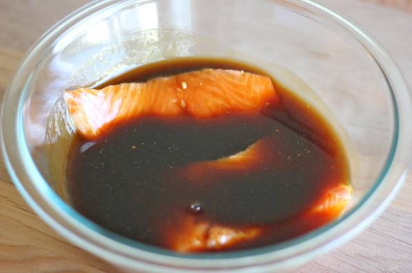 5.取鱼块,可用三文鱼,放入红糖、盐和酱油调好的红烧汁中腌制1个小时。