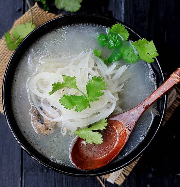 5.放入萝卜丝,火关小一点,煮约30分钟,直到汤变成奶白色。