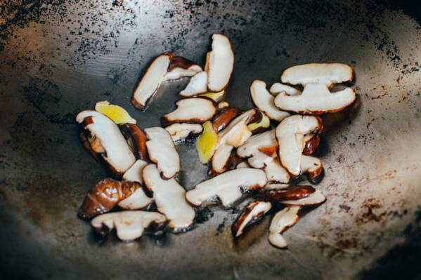 3.锅中放两勺油,油热时,放入生姜,翻炒加入蘑菇,炒2分钟,炒香即可。