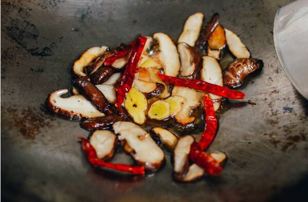 4.加入干红辣椒,炒30秒。