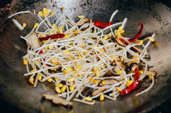 5.放入豆芽,继续炒。