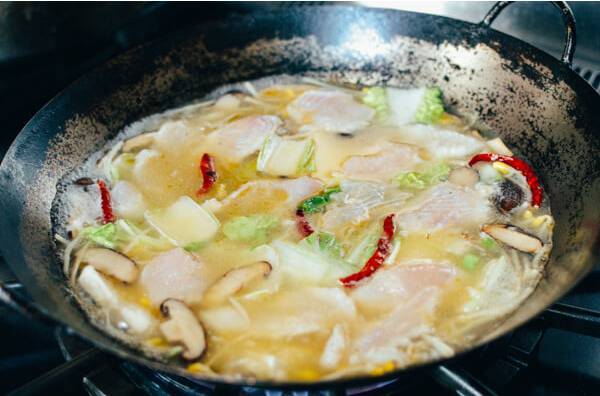 5.热水煮腌好的鱼片,煮约30秒,直到鱼肉变白,把鱼片倒入汤中。