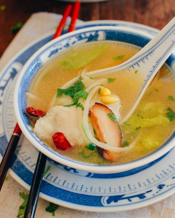 鱼,豆腐,淀粉,香菇,干红辣椒,豆芽,小白菜,高汤,生抽,黄酒,香油,姜,香菜,葱,盐和白胡椒