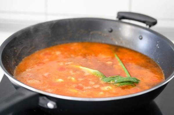 3.西红柿去皮切成小块,锅中放油,油热时,放入大蒜和葱,炒香,加入西红柿丁。文火炒7到10分钟,添加热水,炖煮20分钟。
