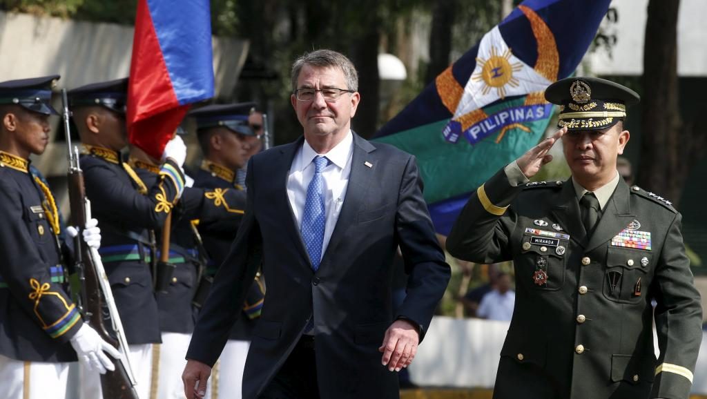 4月15号结束的美国与菲律宾的联合军演,美国国防部长卡特前往菲律宾与中国有主权争端的南海,登上美国航母“斯坦尼斯”号,展示美国护卫南海自由与稳定的决心。此前,他向媒体表示,美国与菲律宾已经启动在南海的联合巡航。中国指出美菲此举损害中国的主权。