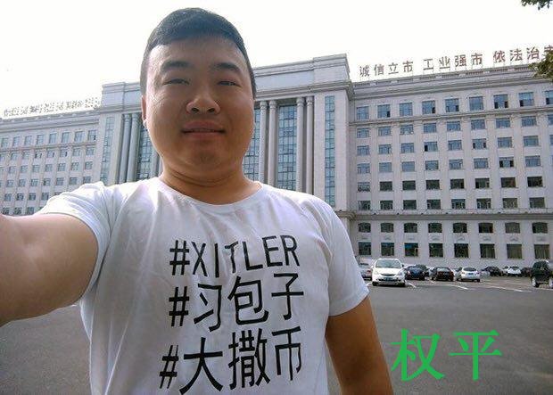 古懿接受德国之声采访说,9月30日早上,权平宣布将于10月1日中共建政日(中国官方称"国庆节")穿上抗议习近平的文化衫上街。他在推特上发布了那件文化衫的照片,胸前写着批评和讽刺习近平的网络流行语:"Xiteler、习包子、大撒币"。"Xiteler"是批评习近平效仿希特勒搞极权政治,"习包子"是讽刺他走访北京庆丰包子店的亲民秀,"大撒币"则借脏话谐音批评他的金元外交。